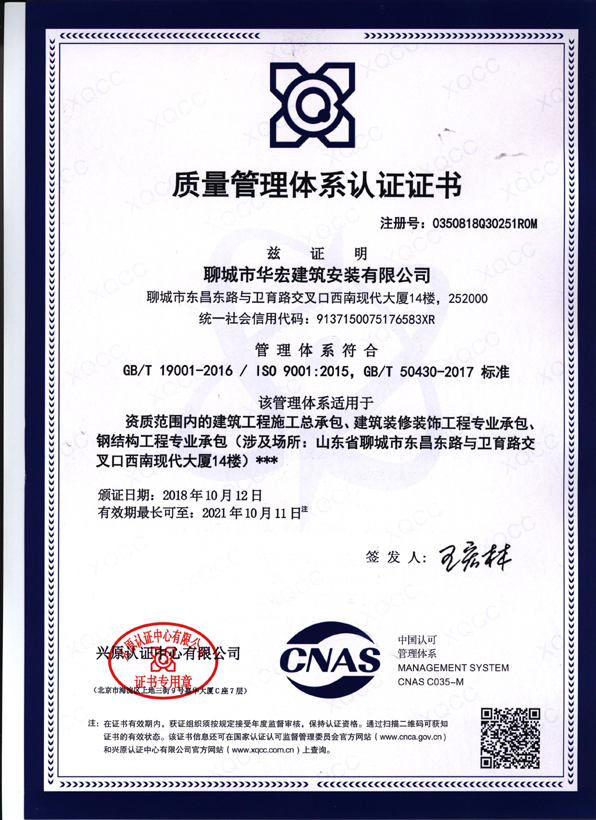 聊城市華宏建筑安裝有限公司成立于2002年5月,公司自2002年成立以來,不斷發揚 “敬業修身 打造精品 開拓創新 弄潮勇進”的創業精神,始終遵循“以質量求生存、靠精品創品牌、憑信譽贏市場”的宗旨,認真奉行“科學 高效 一流”的質量方針